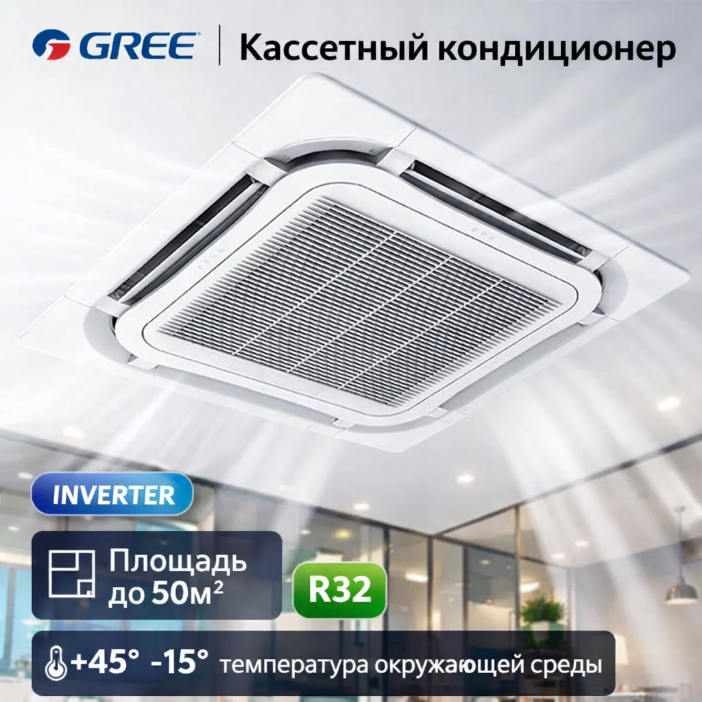 Ищете мощный и экономичный кассетный кондиционер для офиса, магазина или кафе в Кыргызстане? Модель GREE GVD50 WNH B-S 18 Inverter — это современная потолочная кассетная сплит-система с равномерным распределением воздуха 360°, низким уровнем шума и высокой энергоэффективностью. Отличный выбор для помещений площадью до 50 м², где важно комфортное охлаждение и обогрев круглый год.