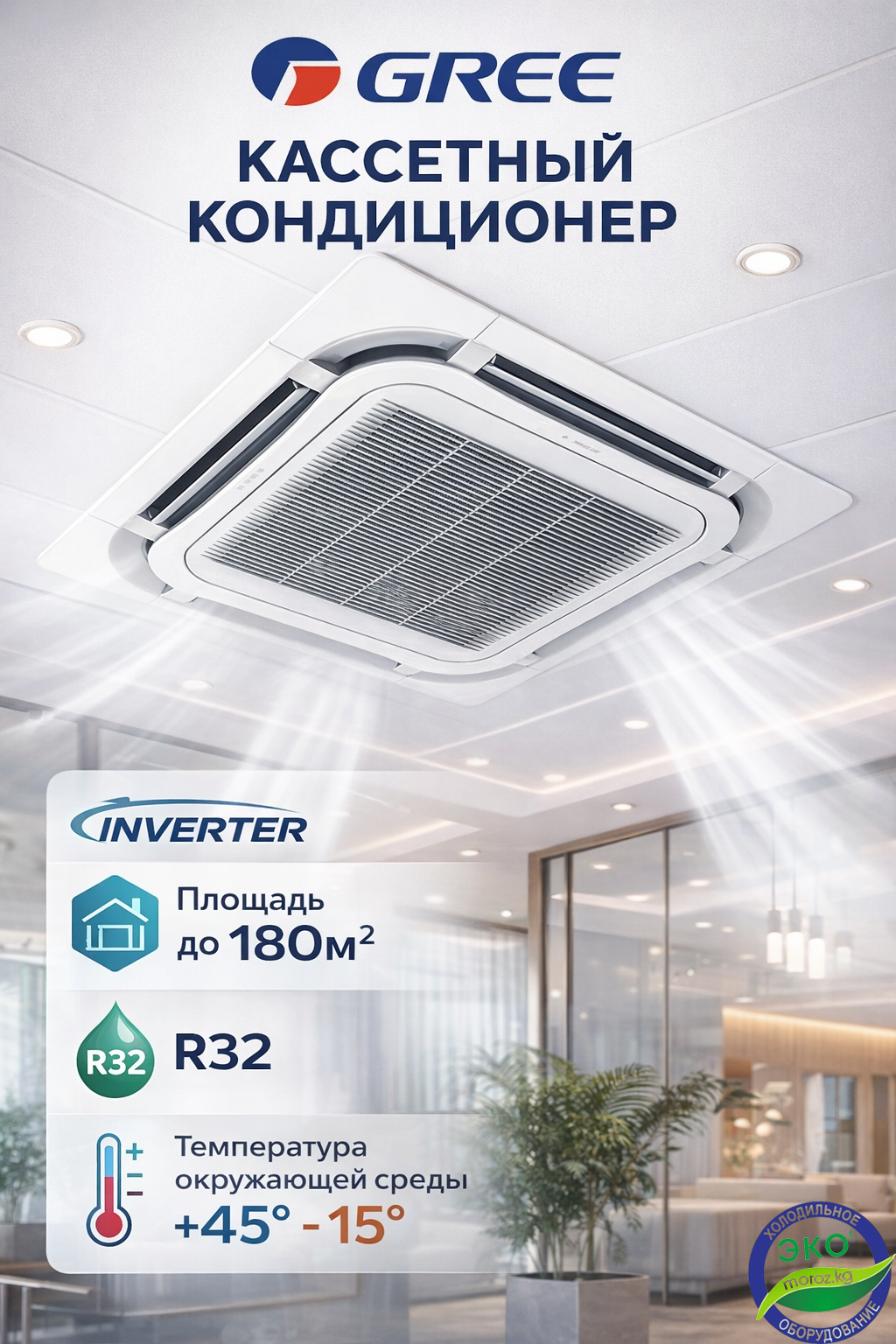 GREE 60 кассетный кондиционер рассчитан на большие помещения: торговые залы, рестораны, салоны, спортзалы, учебные аудитории и офисы.