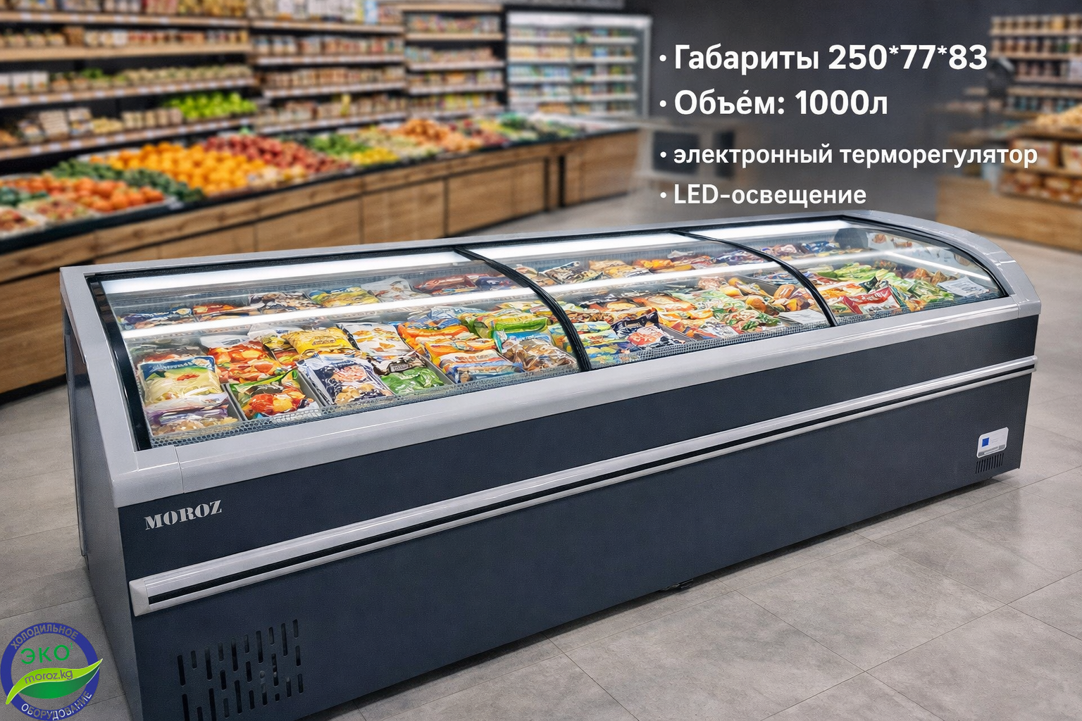 Морозильная бонета MOROZ SD/SC 1000 — это профессиональное торговое холодильное оборудование, предназначенное для хранения и демонстрации замороженных продуктов в супермаркетах, продуктовых магазинах, минимаркетах и торговых павильонах в Кыргызстане. Большой объём камеры 1000 литров, современный дизайн с гнутым стеклом, яркая LED-подсветка и удобные корзины делают эту морозильную витрину идеальным решением для эффективной выкладки товара и увеличения продаж.