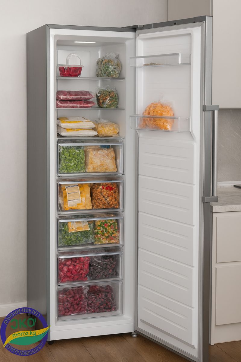 Морозильник оснащен электронным терморегулятором для точной настройки температуры в диапазоне от -12 до -18 градусов. Семь удобных ящиков помогут организовать хранение продуктов различных категорий. Система «Супер заморозка» обеспечивает быстрое охлаждение и сохранение свежести продуктов.